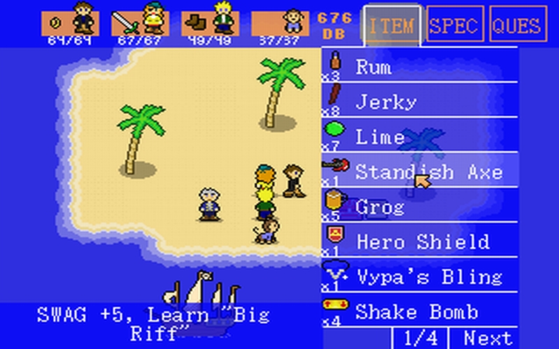 Maximal vier Personen umfasst deine Crew, jedes Mitglied hat dabei seine eigenen Fähigkeiten, die im Kampf genutzt werden können. Die sind beispielsweise Feuerbälle, Statusverbesserungen oder Heilzauber. Statt Mana benötigen sie passend zum Szenario Alkohol-Punkte. Durch konsumieren von Rum, Bier und anderen Getränken kannst du diese wieder auffüllen. Jeder Charakter darf mit einem Ausrüstungsgegenstand ausgestattet werden, der bestimme Werte verbessert. Durch erledigte Gegner sammelt deine Truppe Erfahrung und steigt so immer höher im Level auf.