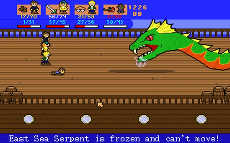 Die Kämpfe laufen in Runden ab. Ein Charakter darf eine Aktion ausführen, sobald sich die entsprechende Leiste gefüllt hat. Neben Standardattacken lassen sich Fähigkeiten und Gegenstände nutzen. Hier gibt es auch spezielle Waffen für den Kampf, die bestimmte Aktionen erfordern, um Schaden zu machen. So wird die Schüttelbombe umso stärker, je schneller du die Maus hin- und herbewegst, die Kanone dagegen muss mit Kanonenkugeln befüllt werden. Auch manche Gegner verfügen über solche Spezialattacken, die du dann durch eine bestimmte Aktion abwehren musst. Somit bestehen die Kämpfe nicht nur aus passiven Kommandos, sondern verlangen ab und zu aktiven Einsatz.