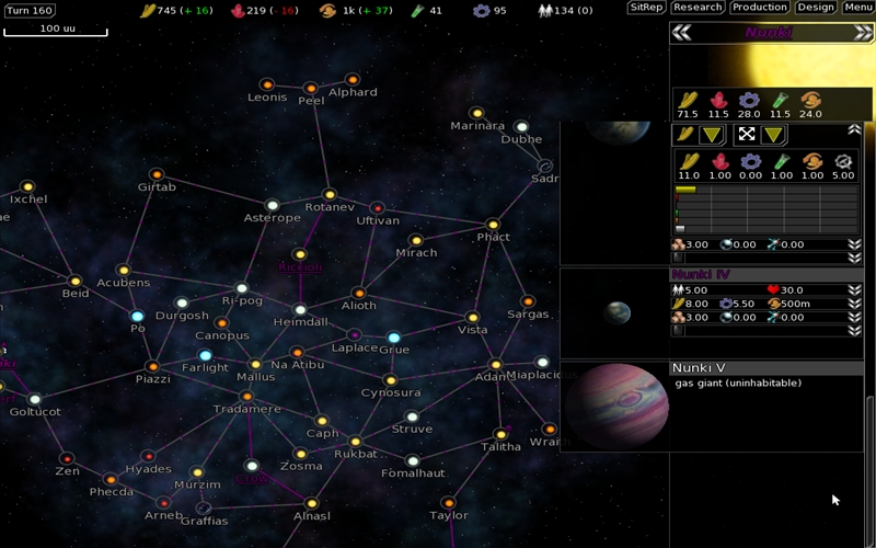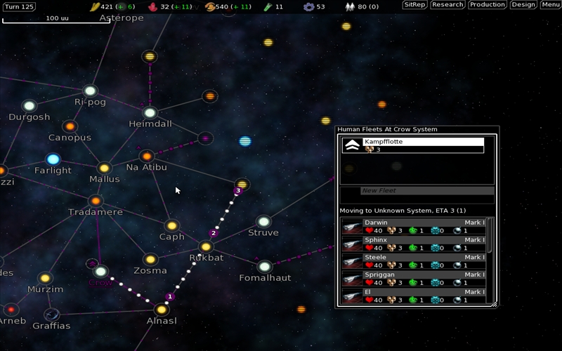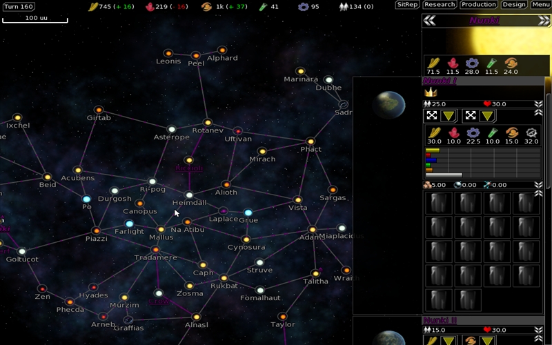 Zugegeben, vom Ziel ist FreeOrion noch ein großes Stück entfernt. So fehlen die manuellen Raumschiffkämpfe oder auch die Diplomatie noch, trotzdem kann man es jetzt schon spielen. Die Übersichtskarte besteht aus einer Galaxie, auf der sich viele Sonnensysteme befinden. Jedes Sonnesystem besteht aus mehreren Planeten, die z.B. riesige, gut bewohnbaren Planeten, unbewohbare Gasplaneten oder Asteroiden sein können. Mit einem Heimatplaneten und einer kleinen Flotte startet das Spiel. Weitere bewohnbare Planeten können mit entsprechenden Raumschiffen besiedelt werden. So kann auch in die nahegelegenen Sonnensysteme expandiert werden.