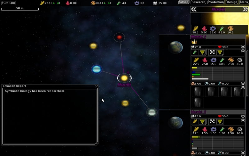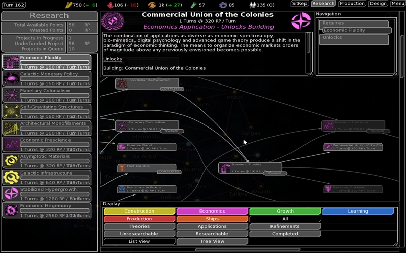 Auf jedem Planeten kann die Wirtschaft in mehrere Richtungen gesteuert werden: Nahrung, Mineralien, Industrie, Forschung und Handel. Nahrung wird benötigt um die Bevölkerung zu vergrößern und zu erhalten, Mineralien und Industrie werden benötigt um Gebäude und Raumschiffe zu produzieren und das durch Handel erhaltene Geld wir zum Aufrechterhalten der Flotte benötigt. Die Forschung ist in zahlreiche Richtungen unterteilt, beispielsweise Wirtschaft, neue Waffen oder auch Navigationsverbesserungen. Flotten werden immer als Symbol über dem Sonnensystem in dem sie sich befinden angezeigt. Befinden sie sich links, sind sie unterwegs, rechts sind sie in Bereitschaft. Die aktuelle Version macht Lust auf mehr und zeigt auf jeden fall schon, das FreeOrion auf dem richtigen Weg ist. Wer die Entwicklung mit vorantreiben will kann sich in diversen Bereichen an der Entwicklung beteiligen.
